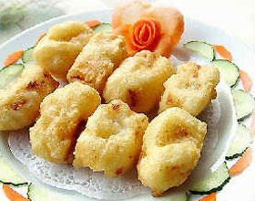 4.锅坐火上,下花生油,烧至5~6 成热时,将牛奶坯切成菱形小块,先沾上干淀粉,再挂脆浆,下油锅炸至金黄色捞出;