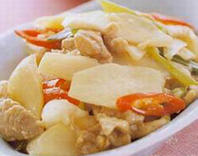 3.滑勺内加植物油烧热,放入葱丁煸出香味,加入山药片煸炒,随加盐、味精炒入味,加木耳、肉片翻炒几下即成。