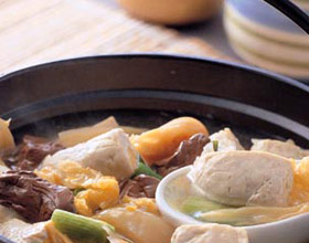 6.烹入酒,加白汤,放入豆腐、鸭血、盐、酱油;