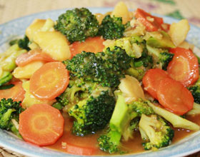 花开富贵:'1.菜花一朵朵切下,先用盐水浸泡10分钟,再用开水氽烫过捞出;2.胡萝卜去皮,先煮熟,再切滚刀块;3.土豆去皮,切滚刀块,用盐水先漂过,再捞出沥干;...