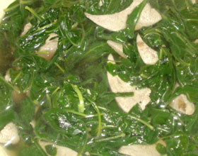 枸杞叶猪肝汤:'1.枸杞叶用盐水洗干净,捞出放在竹箕上,沥干水;生姜切成薄片。2.猪肝切成约1口大小的薄片,浸在腌料(姜5克、酱油15克、淀粉10克、料酒5克)中。3....    详细介绍