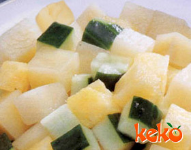 4.将菠萝丁、土豆丁、黄瓜丁加入精盐、白糖拌匀即可。