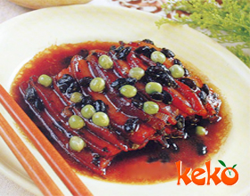 3.放入盆内,加入豆豉、葱段、姜丝、酱油、黄酒、味精、白糖、清汤250毫升,入笼蒸约30分钟取出,凉透成冻即成;