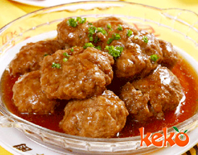 3.炒勺加底油,下入葱姜丝炝锅,加入鸡汤250克、料酒、酱油、玉兰片、元蘑片、精盐,放入丸子、浸泡花椒的水烧开后,改小火煨10分钟,再改旺火,加入味精,用水淀粉勾芡,淋入明油翻勺,盛入盘内即成。