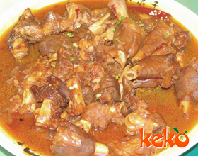 2.锅内放底油,将大料炸成枣红色,放入葱姜末炝锅,加酱油、料酒、味精、高汤,放入羊蹄煮10分钟,用淀粉勾芡,淋香油,出锅即成。