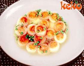 4.每个“扳指”均填入干贝1粒,装完摆入扣碗,浇上干贝汁150克;
