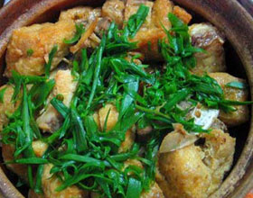 鸿运当头:'1.鱼头洗净,拭干,剖开,对切成4大块,用5大匙油将鱼头两面煎黄盛出;2.豆腐切成长厚片,用油煎黄盛出后放入耐煮锅或沙锅内,面上放入煎好的鱼头;3...