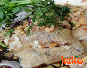 白切鸭:'1.红辣椒切细丝;2.姜切片备用;3.芝麻放干锅内炒香待用;4.香菜洗净切碎末;5.将鸭尾切去,撕去肥油,洗净控干水分,用8克酒搽匀,放姜片蒸1个小时;...    详细介绍
