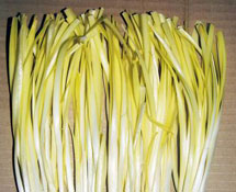 韭黄为韭菜经软化栽培变黄的产品。是韭菜隔绝光线,完全在黑暗中生长,因无阳光供给,不能产生光合作用,合成叶绿素,长成的韭菜,就会变成黄色,称之为“韭黄”。选购以叶片无枯萎、腐烂、无绿色的为好。初春时节的韭菜品质最佳,晚秋的次之,夏季的最差。春季食用有益于肝。
