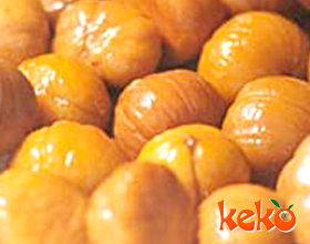桂花板栗:'1.用刀在板栗鼓起的一面切一字刀,下入开水锅中烫一下捞出,把板栗肉取出,切去黑烂变质的部分,再切成1厘米见方的丁。2.将猪油烧到六成热时,下入板...    详细介绍