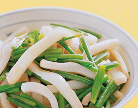 蒜苗炒鱿鱼:'1.将鱿鱼洗净切成丝,焯水沥干;2.蒜苗洗净切段;3.油锅上火烧八成熟,将鱿鱼丝放入略爆一下,倒出沥油;4.锅留底油,快速煸炒蒜苗至软;5.加入调味料...    详细介绍