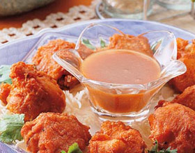 炸虾酱鸡块:'1.虾酱等调料调匀成汁,将生鸡块放入腌渍2小时以上;2.锅中加物油烧热,将鸡块放入炸熟,至金黄色。...    详细介绍