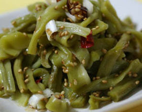 芝麻贡菜:'1.将发制好的贡菜切寸段,用开水烫一下,捞出沥干;2.芝麻拣去杂质,放入锅内,在小火上慢慢炒至酥香;3.将贡菜放入盘内,放精盐,味精,麻油调匀入味...