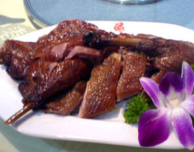 樟茶鸭:'1.将光鸭在背尾部横开长6至7厘米的口子,挖出内脏,割除肛门上的鸭臊,洗净。2.将香料(先用布袋装好捆紧口,香料:大料、花椒、陈皮、桂皮、排草、灵...
