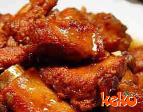 3.勺上火放底油,用葱段、姜块炸锅,添汤400克,加白糖、酱油、精盐、醋、花椒,再把排骨放入,用小火将排骨焖烂,汤成浓汁时,取出葱段、姜块。