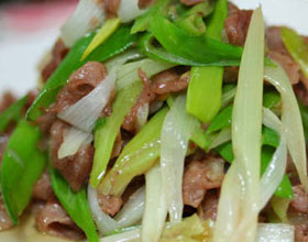 4.待肉片变色后,放入葱块、精盐、味精、米醋、酱油拌炒;