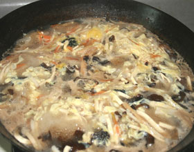 2.将猪血、豆腐、肉丝、海参、木耳放入高汤中同煮;汤碗中预先放入葱花、姜末、醋;待汤开后加入盐、味精、酱油、胡椒粉拌匀,同倒入蛋汁(成蛋花),用生粉水8克(淀粉3克加水)勾芡,即倒入汤碗中,调匀后淋加麻油,即可上桌。
