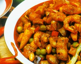 八宝辣酱:'1.猪肚放进沸水内煮熟捞起,冲冷水洗净,切丁;鸡肫洗净,切片;油豆腐、豆腐干、瘦猪肉、笋、鸡肉洗净,切丁;虾米、虾仁洗净;青豆放至沸水中烫过捞...
