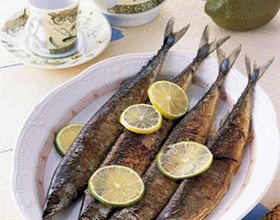 烤秋刀鱼:'1.秋刀鱼清洗净后,抹上酒、盐、胡椒粉腌10分钟左右;2.将腌好的秋刀鱼放在烤架上,以中火烤20分钟即可。...    详细介绍