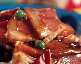 猪头肉皮厚而发粘,肉少而嫩,无筋膜、韧带,富胶质,肥而不腻,耳骨脆而可食。