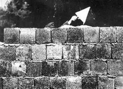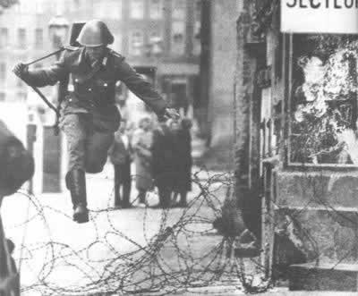 1961年8月13日凌晨,在铁丝网网成的柏林墙即将封闭的一瞬间,一个参与围墙行动的东德士兵突然跳越铁丝网,投奔西德一方