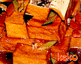 博山豆腐箱:'1.将博山豆腐去皮,改成4 厘米长,宽、厚各2 厘米的块;2.炒锅置中火上,放入花生油,烧至七成热,把豆腐块下入油锅内炸至金黄色捞出;3.再用小刀贴豆...    详细介绍