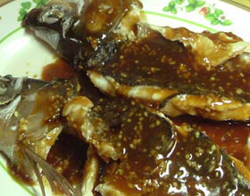 8.把锅内的汤汁,加入白糖、醋和湿淀粉调匀的芡汁,用手勺推搅成浓汁,浇遍鱼身即成,上席随带胡椒粉。