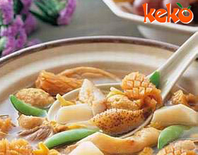 八宝豆腐:'1.豆腐去硬边、硬皮,切成3厘米见方的大片。猪肚两面搓洗干净;海参、鱿鱼洗净;冬菇泡发,去蒂;将豆腐、猪肚、海参、鱿鱼、冬菇与火腿切成3厘米长的...    详细介绍