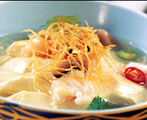 水豆腐花汤:'1.先将水豆腐花用清水漂清,再和以清水,一起置入锅内,投以香菌、扁尖等物。2.上盖煮透,即可起锅,如再加上大蒜叶,其味更佳。...