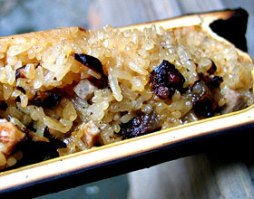 粉蒸竹筒鱼:'1.糯米、粳米和大料放入锅内用温火炒香,晾凉,磨成细粉。肥膘肉切成细丝。葱切成花,姜切成米。蒜子剥去外皮拍烂剁碎。2.将肥鱼去鳃、鳍,开膛去内脏...