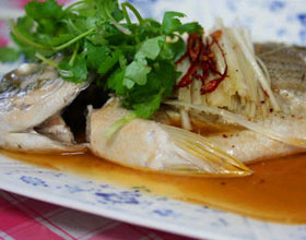 清蒸加吉鱼:'1.将加吉鱼刮去鳞,掏净鱼鳃、内脏,洗净,在鱼身上打1.7 厘米见方的柳叶花刀;2.剞好刀后再放入开水中一烫即捞出,撒勺细盐,整齐地摆入盘内;3.猪肥...