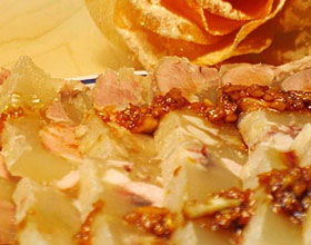 水晶肘花:'1.猪肘子带皮刮洗干净,切2厘米见方的块,用沸水焯过;2.锅中加水和葱、姜、花椒袋烧开,放入猪肘块用微火将其炖烂;3.捞出肘块和料袋,汤中加盐、味...