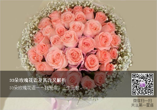 “33”并不是一个普通的数字,而是个神奇的数,其谐音为“生生”,代表着生生世世、至死不渝的爱;33,寓意三生三世,表示今生来世都要爱;33,外型象耳朵,代表两个情人之间耳鬓厮磨、缠缠绵绵、亲密相处的情景,表示亲热、爱抚、呢喃、私语。所以,33朵玫瑰花语是三生三世的爱,33朵玫瑰代表爱你三生三世。