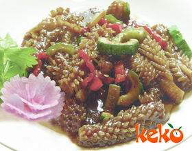 6.炒锅置旺火上,加菜籽油烧七成热时,倒入鱿鱼卷,随即用漏勺捞起,沥出余油待用;