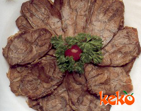 9.上桌时,用鸡汤25毫升加入味精调匀,浇在牛肉上即成。