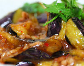 肉末烧茄子:'1.猪肉50克洗净剁碎;2.茄子洗净,去外皮,切马蹄块;3.毛豆剥去外皮,洗净,用净开水焯一下,过凉水,保持翠绿色;4.炒勺上火,放入花生油,烧至七成...