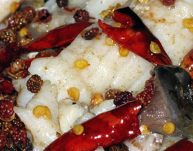 怪噜鱼:'1.将草鱼宰杀,去鳞、内脏及鳃洗净;2.将净草鱼去掉头、尾,剔下两扇鱼肉,片成相连的坡刀片,同鱼头、尾加入姜葱汁、胡椒粉、料酒、精盐拌匀腌入味,...