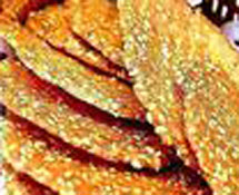 关于薄脆饼的制食法,明清烹饪古籍《饮馔服食X》、《食宪鸿秘》和《调鼎集》中均有记载。其传统制法是:“蒸面每斤入糖四两,油五两,加水和,擀开,半指厚,取圆(即圆形面片)粘芝麻入炉。”