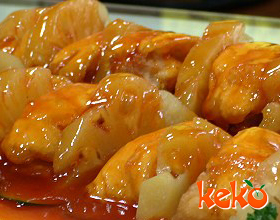 菠萝鸡:'1.柠檬取皮磨茸,肉榨汁,部分去核备用;2.将鸡洗净控净水分,用腌料搽匀,放姜蒸熟,约蒸20分钟,冷却后切块;3.菠萝切粒状,将碗用水沾湿,放3片柠...    详细介绍