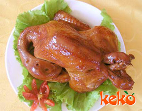道口烧鸡:'1.将鸡宰杀好,血放净,趁鸡身尚温时,放入60~70℃的热水内烫5 分钟左右,再将毛煺尽,这可使光鸡洁净白亮,色形美观;2.然后斩去鸡爪,并在鸡颈上方...