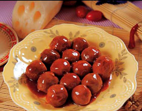 6.放油菜片、胡萝卜片、玉兰片煸炒一下,添入肉汤250克,加酱油、料酒、精盐、白糖,把丸子放入,用小火煨熟;