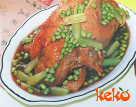 6.炒勺坐旺火,加猪油烧至七八成热,下毛豆、盐炒至豆变色,倒入煨鸡的沙锅中,加味精再煨一下即成。
