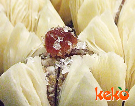 9.把生坯分批分开排放在漏勺中,下入三至四成热的油锅中,炸至花瓣开放,酥层清晰成熟,取出装盘;
