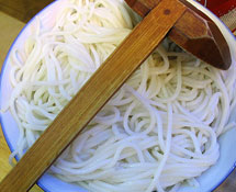 其制法记有两种。其一,“粳米甚洁,碓筛绝细粉,汤溲稍坚,置锅中煮熟。杂生粉少许,擀使环节,折切细条,暴燥。入肥汁中煮,以胡椒、施椒、酱油、葱调和。”其二,“粉中加米浆为糨,揉如索绿豆粉,入汤入釜中,取起。”