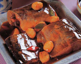 豆瓣酱烧肥鱼:'1.鲇鱼刮去涎液,去掉鳃和鳍,开膛去内脏,洗净;2.从鱼身的中间剁断成头尾两段,将腹内脊骨稍剁开,用盐、料酒腌一下后洗净;3.水发香菇去蒂洗净,和...    详细介绍