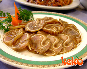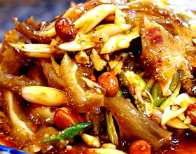 拌猪耳朵:'1.将猪耳朵残毛钳尽,刮洗干净;2.先用开水氽透,再刮洗一遍,入汤内煮熟;3.捞出后用冷水漂上;4.葱切末;5.将葱、酱油、辣椒油、味精、花椒粉、香油... 详细介绍