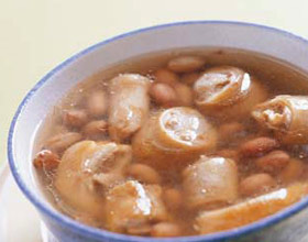 花生煲猪尾:'1.先将猪尾焯去汗毛,刮洗干净,斩为段。2.将花生肉洗干净,一起放入瓦煲里,注入开水2000克,煲好后得汤1500克。3.煲时用盖盖着煲至稔,用精盐调好味...