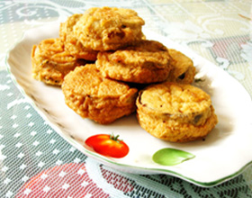 酥炸茄饼:'1.将猪五花肉、葱、姜、蒜切成末,加入调料制成肉馅。2.茄子洗净,斜切夹刀片,将肉馅填充其中,挂上用鸡蛋、面粉、水调成的糊备用。3.锅内注油烧热,...    详细介绍
